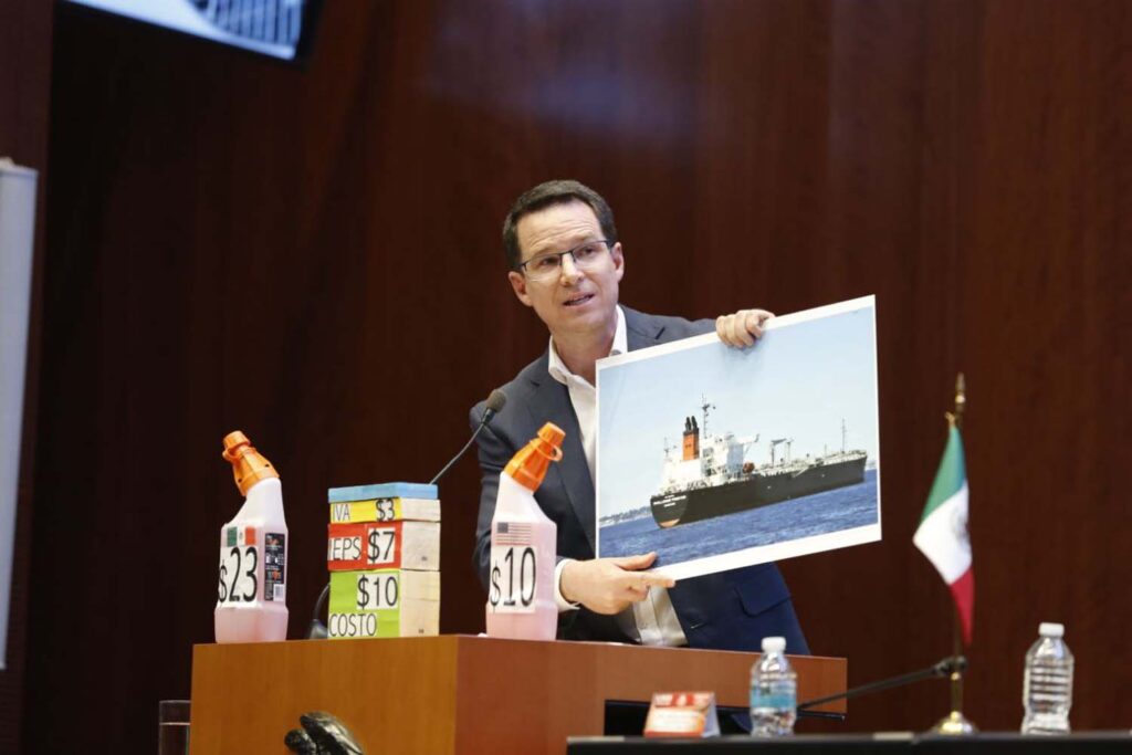 El coordinador del PAN, Ricardo Anaya, cuestionó al gobierno sobre el robo de hidrocarburos, señalando que cada embarcación puede cargar hasta 50 millones de litros de gasolina, equivalentes a 350 millones de pesos, y preguntó dónde quedaron los recursos faltantes.