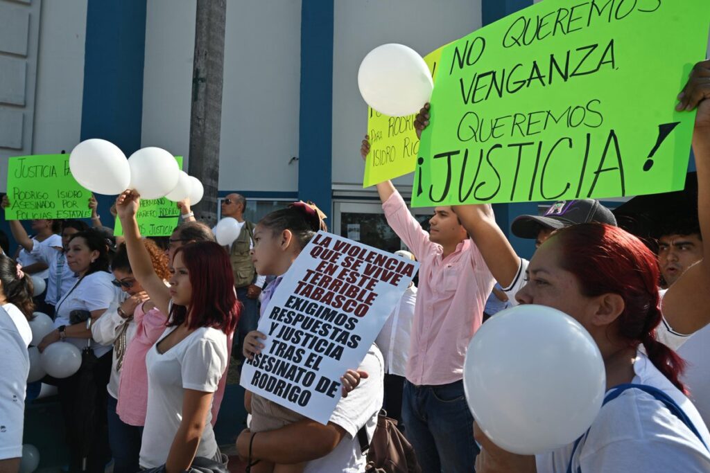 Alrededor de cien personas se manifestaron frente a la Procuraduría General de Justicia de Tabasco (FGE) para exigir justicia por la muerte del universitario Rodrigo Isidro Ricárdez, quien presuntamente fue baleado por agentes de la policía estatal.