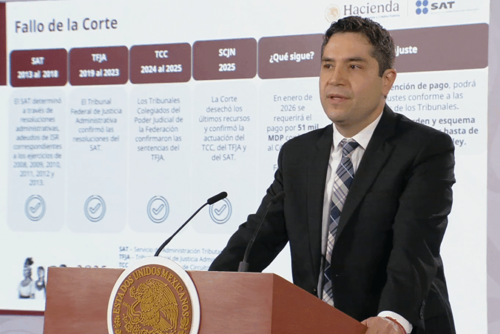 El funcionario explicó el caso durante la conferencia matutina realizada en Palacio Nacional, donde precisó que la notificación formal del requerimiento de pago se realizará en enero de 2026.