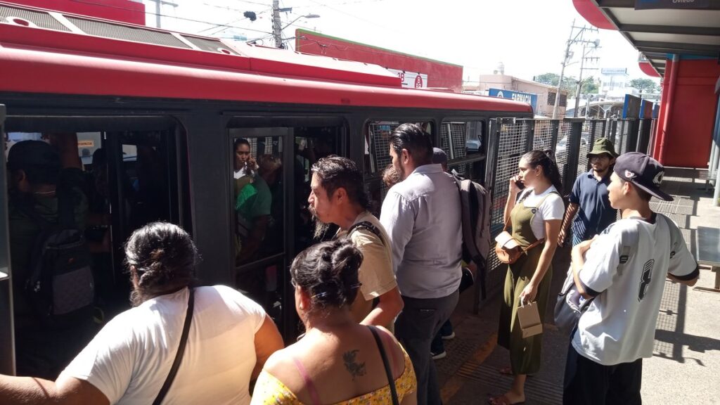 Cuando finalmente arribó el autobús, apenas pudieron abordar, ya que circulaba al máximo de su capacidad, con entre 80 y 90 personas sentadas y la mayoría de pie, apiñadas y con riesgo de lesiones por la forma abrupta en que se abren las puertas en cada estación.