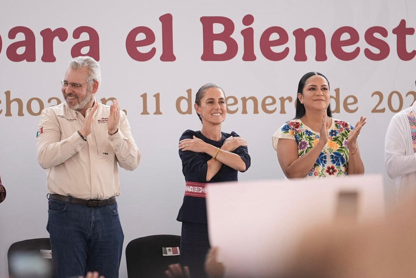 La presidenta fue recibida con entusiasmo por la población, que celebró los anuncios previos realizados por funcionarios federales, entre ellos la construcción de hospitales y clínicas, la ampliación de la carretera Uruapan–Lázaro Cárdenas y el otorgamiento de becas a estudiantes.