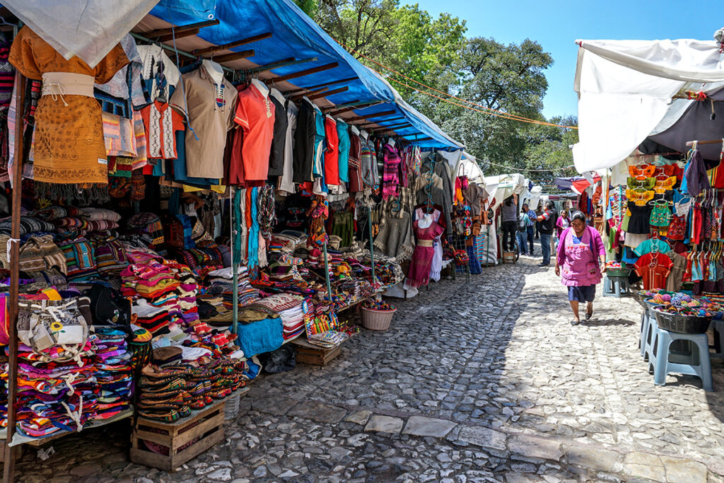 En el mercado artesanal de Coyoacán, los locatarios explicaron que reciben artesanos de entidades como Estado de México, Tlaxcala, Chiapas, Guerrero y Oaxaca, quienes elaboran textiles incluso a solicitud del cliente.