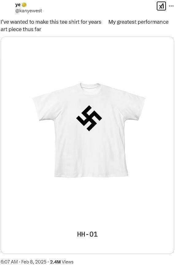 En febrero pasado, Ye comercializó productos con esvásticas en su sitio web y, meses después, lanzó una canción titulada Heil Hitler. En otras ocasiones, ha elogiado al dictador nazi y difundido mensajes antisemitas en redes sociales.