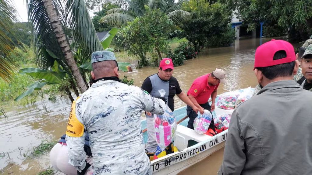 Autoridades estatales y federales colaboran en labores de evacuación y entrega de ayuda humanitaria a las personas damnificadas.