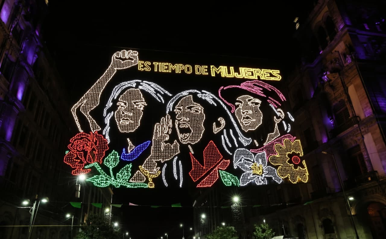 La jefa de Gobierno de Ciudad de México, Clara Brugada, encabezó el encendido del alumbrado monumental en el Zócalo de la Ciudad de México como homenaje a la lucha histórica de las mujeres y a los avances alcanzados en materia de derechos e igualdad.